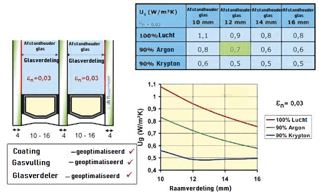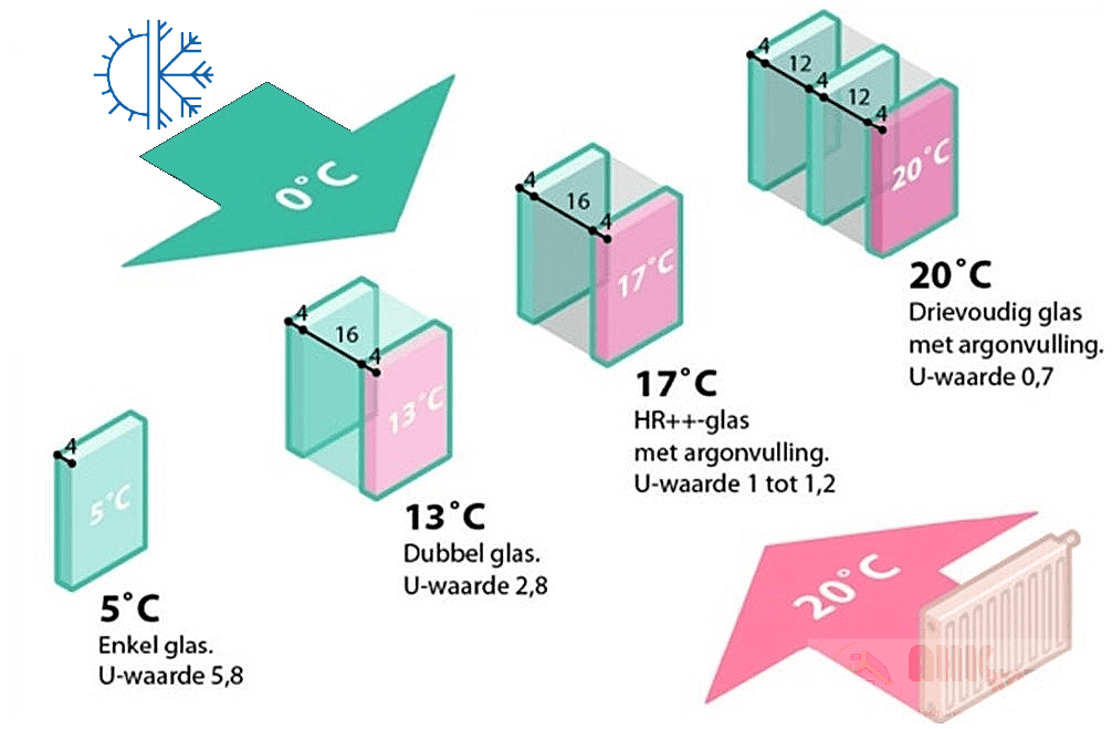 Enkel glas, zoals dat 50 jaar geleden werd gebruikt, heeft een Ug-waarde die rond de 5 schommelt. Dubbel glas (sinds de jaren zeventig populair) scoort rond de 2,8. Het HR++ glas dat de laatste decennia de norm is, haalt een Ug-waarde van 1,1.